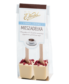 Mieszadełka z czekolady białej z maliną do samodzielnego przygotowania pysznego czekoladowego napoju. Wystarczy zamieszać w gorącym mleku i obserwować jak czekolada się rozpuszcza. Dzieciom sprawią radość a dorosłym przypomną smak dzieciństwa.