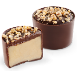 Kremowe nadzienie z orzechów włoskich, w skorupce z czekolady gorzkiej udekorowanej cząstkami karmelizowanych orzechów.