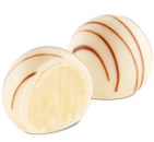 Kokosowe nadzienie z białej czekolady z delikatną alkoholową nutą, w skorupce z czekolady białej dekorowanej czekoladą mleczną.