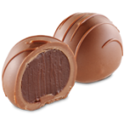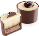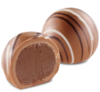 Czekoladowo-mleczne nadzienie z delikatną alkoholową nutą, w skorupce z czekolady mlecznej dekorowanej czekoladą białą i gorzką.