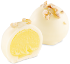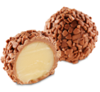 Kremowo-czekoladowe nadzienie z likierem jajecznym Advocat i nutą wanilii, w skorupce z białej czekolady udekorowanej cząstkami migdałów.