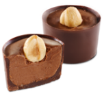 Gładkie, kremowe nadzienie z orzechów laskowych, w skorupce z mlecznej czekolady ozdobionej gorzko-czekoladowym wzorem.