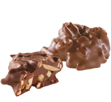 Intensywnie chrupiący nugat z orzechów laskowych z dodatkiem karmelizowanych migdałów i prażynkami zamknięty w skorupce z czekolady mocno mlecznej.