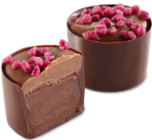 Malinowe, aksamitne nadzienie z białej czekolady, w skorupce z czekolady deserowej.
