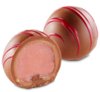 Aksamitne i gładkie nadzienie truskawkowe z białej czekolady, w skorupce z czekolady mlecznej.